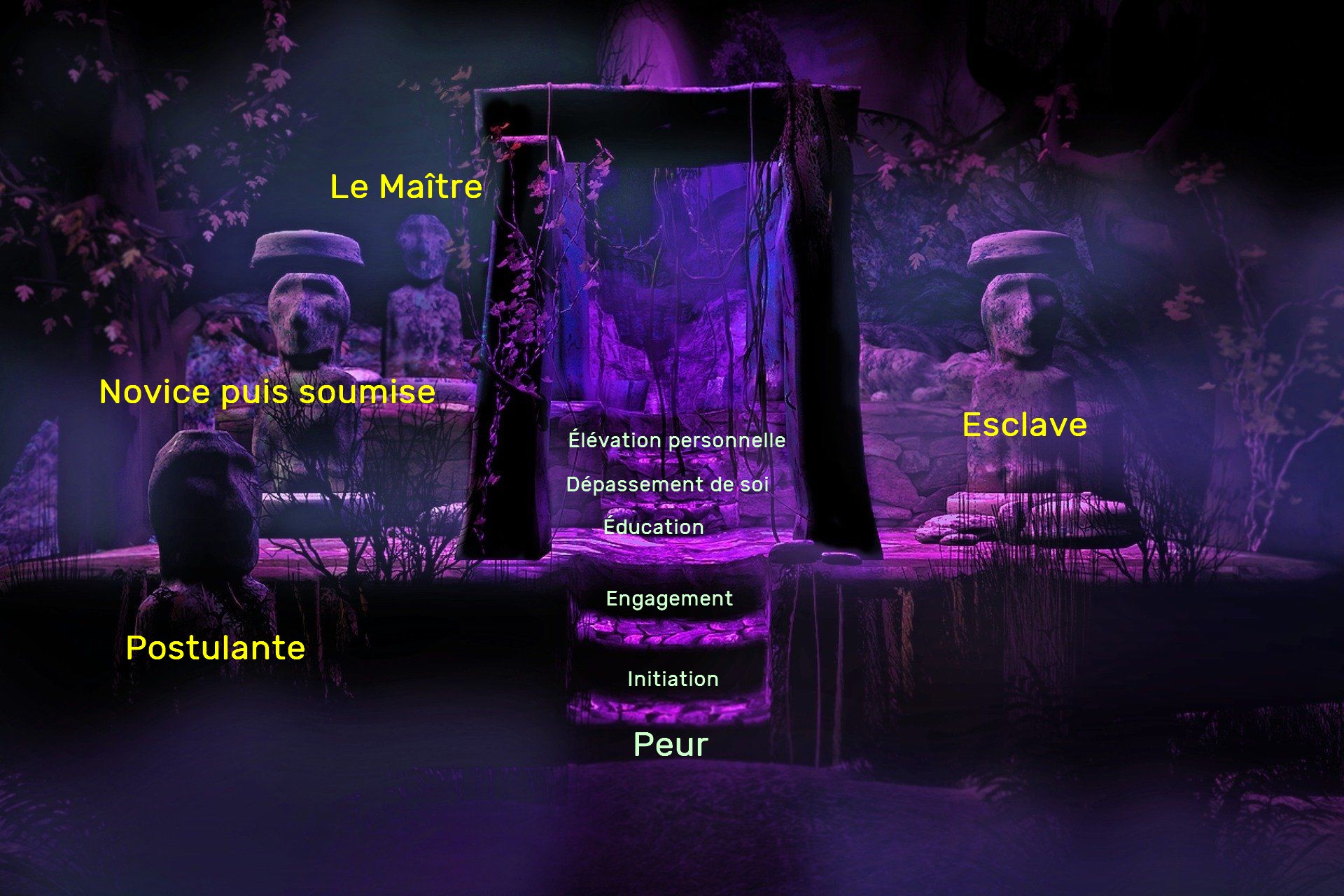 J’ai trouvé par hasard cette image libre de droit. Elle symbolise le parcours initiatique et les mystères du BDSM . Il y a au cente une porte et des marches. On gravit des marches qui symbolisent le chemin à faire pour s’élever et laisser ses peurs derrière soi. Quand on franchit la porte on rentre dans ce monde plein de mystères, on se libère des ses peurs, de ses limites puis on s’élève marche après marche. Chaque marche symbolisant une limite à franchir, une élévation de l’être... Sous l’œil bienveillant de la une, reine de la nuit qui éclaire notre chemin dans l’obscurité. Les statues symbolisant les 4 étapes de la la soumission, la postulante avant le passage de la porte et les deux états de soumission, à gauche novice et soumise, à droite esclave. |